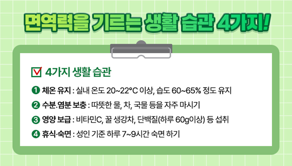 몸이 회복할 수 있도록 충분히 쉬세요. 스트레스나 과도한 활동은 회복을 늦출 수 있습니다. 성인의 경우 하루 7~9시간 정도의 숙면이 권장됩니다. 충분한 수면은 면역력 강화의 기본입니다.