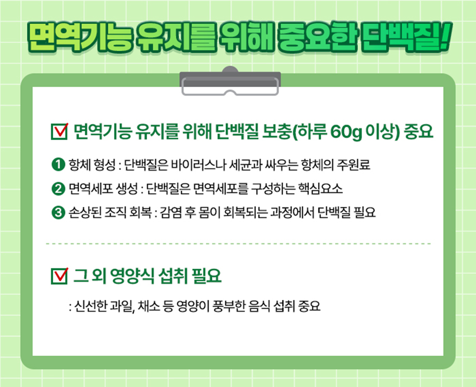 그리고 면역기능을 유지하기 위해서는 단백질 보충(하루 60g 이상)이 중요합니다. 단백질은 바이러스나 세균과 싸우는 항체의 주원료이면서 면역세포를 구성하는 핵심요소입니다. 또한 감염 후 몸이 회복되는 과정에서 단백질이 필요합니다.
