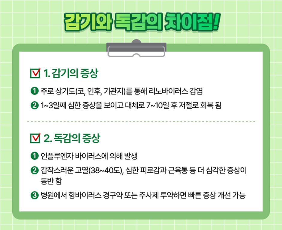 한편 독감은 인플루엔자 바이러스에 의해 발생하며, 갑작스러운 고열(38~40도), 심한 피로감과 근육통 등의 더 심각한 증상이 동반될 수 있습니다. 독감 증상이 의심되는 경우 빨리 병원을 찾아서 콧물 검사로 독감바이러스 존재 여부를 확인한 후 항바이러스 제제인 경구약(상품명: 타미플루) 혹은 정맥 주사제(페라미비르)를 투약 받을 경우 증상의 빠른 개선이 가능합니다.