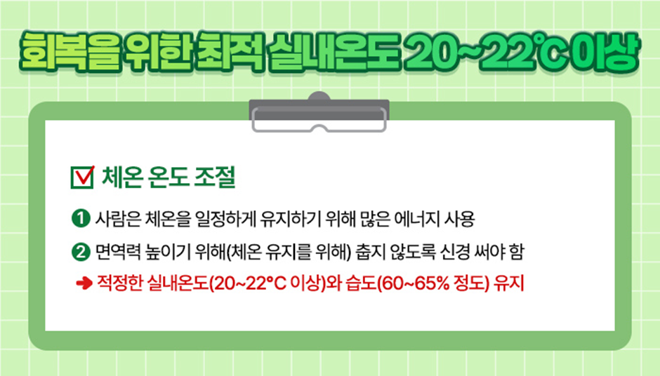 적정한 실내온도(춥지 않은 온도로 섭씨 20~22도 이상)와 습도(60~65% 정도)를 유지하는 것도 도움이 됩니다.