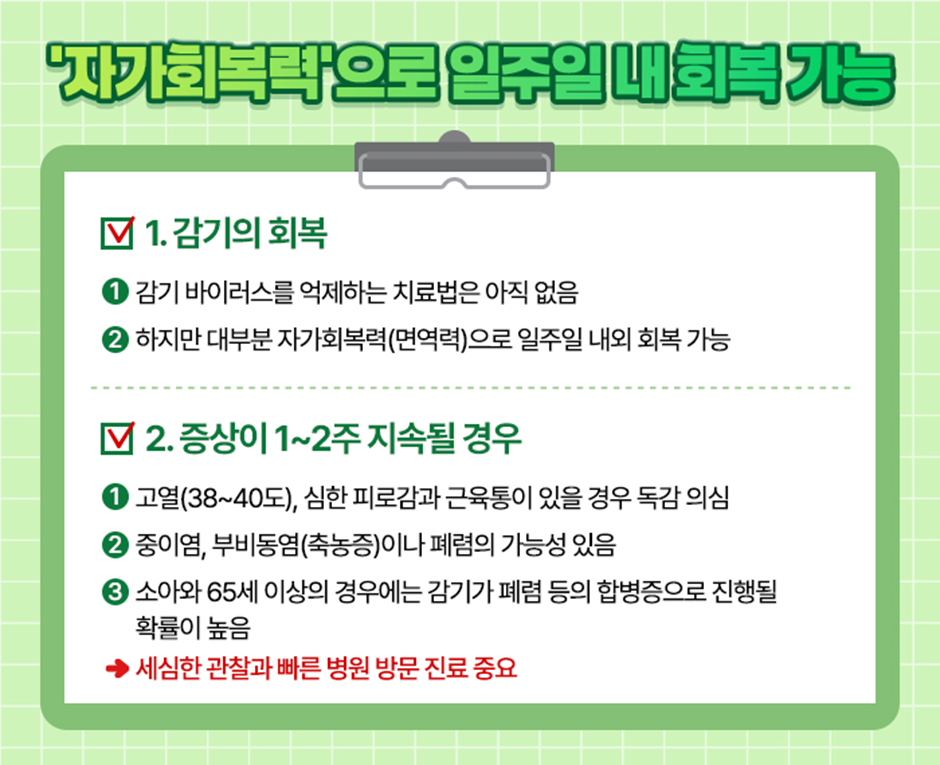 하지만 갑작스러운 고열(38~40도), 심한 피로감과 근육통 증상으로 독감이 의심될 경우 혹은 감기 증상이 1~2주 이상 지속될 때는 중이염, 부비동염(축농증)이나 폐렴의 가능성이 있으므로 꼭 병원에 방문해 의사의 진찰을 받아보세요. 상대적으로 소아와 65세 이상의 경우에는 감기가 폐렴 등의 합병증으로 진행될 확률이 높으므로 보다 세심한 관찰이 필요합니다.