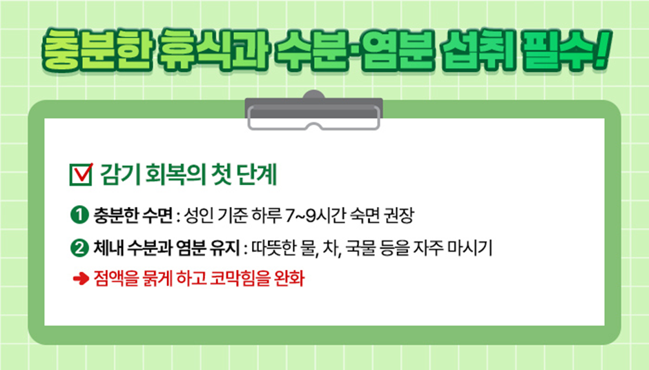 몸이 회복할 수 있도록 충분히 쉬세요. 스트레스나 과도한 활동은 회복을 늦출 수 있습니다. 성인의 경우 하루 7~9시간 정도의 숙면이 권장됩니다. 충분한 수면은 면역력 강화의 기본입니다.