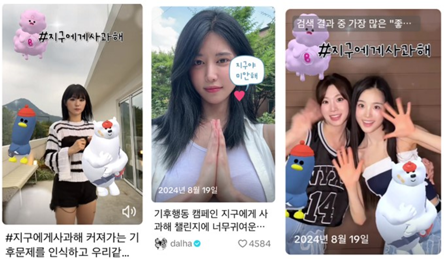 ‘지구에게 사과해’ 챌린지는 (주)오마이어스가 주최하고 숏폼 플랫폼 틱톡이 후원하는 사회공헌 캠페인입니다. 틱톡 크리에이터와 가수, 인플루언서 등이 참여한 이 캠페인은 ‘지구에게 사과해’ 캠페인송과 댄스 챌린지로 기후 변화에 대한 메시지의 파급력을 높였습니다.