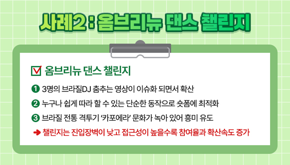 그리고 이 춤에는 ‘카포에라’라는 브라질 전통 격투기, 춤, 음악이 결합된 독특한 문화가 녹아 있어 젊은 세대의 호기심을 더욱 자극했습니다. 이처럼 챌린지는 진입장벽이 낮고 접근성이 높을수록 또한 호기심을 유도하는 한 방이 있을 경우 참여율과 확산 속도가 증가합니다.