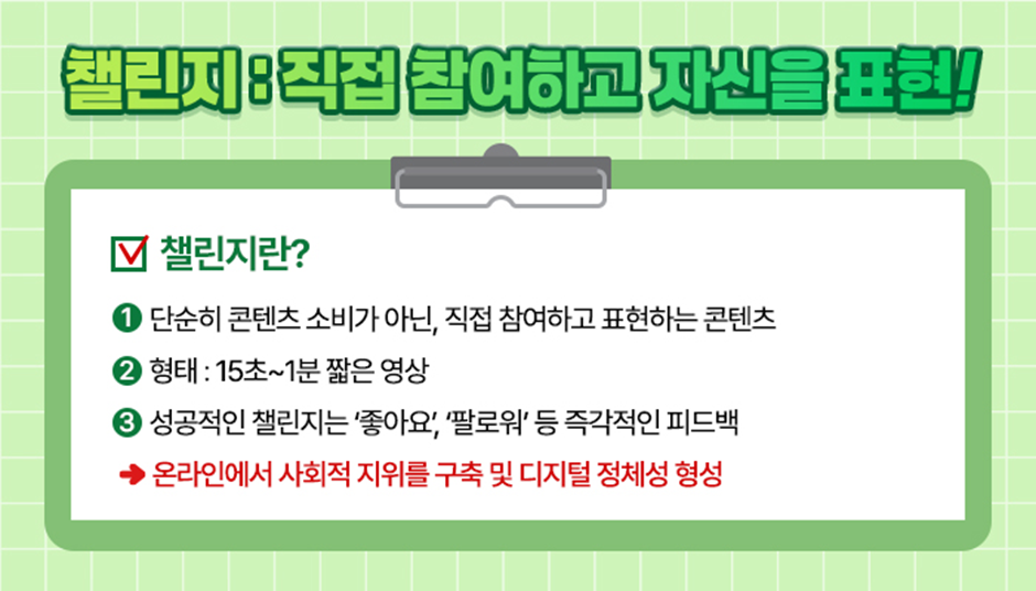 챌린지 콘텐츠는 단순히 콘텐츠를 소비하는 데 그치지 않고, 직접 참여하고 자신을 표현하는 콘텐츠입니다.