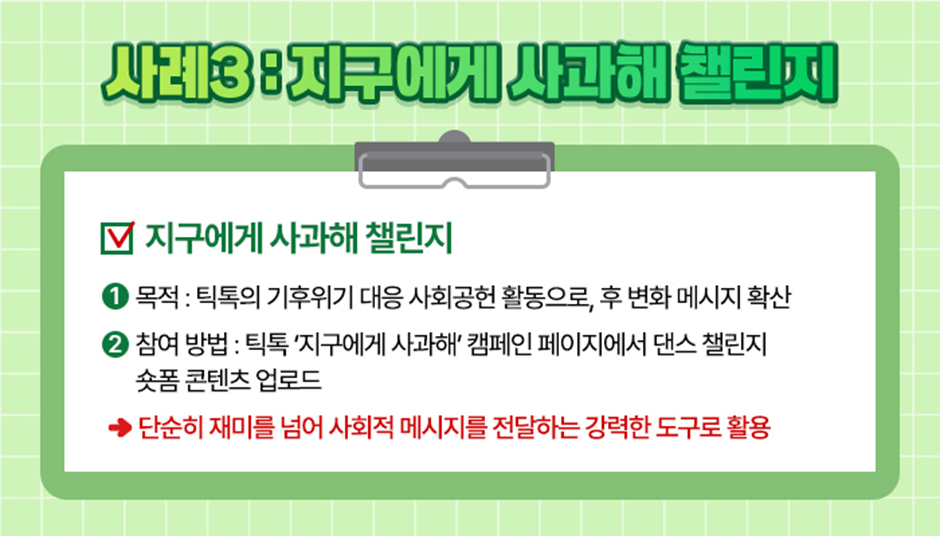 챌린지 콘텐츠는 댄스 등 단순히 재미를 넘어 사회적 메시지를 전달하는 강력한 도구로도 활용되고 있습니다.