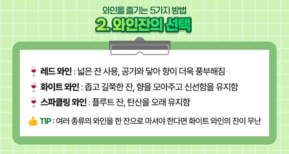 💡 TIP: 만약 여러 종류의 와인을 한 잔으로 마셔야 한다면, 화이트 와인 잔을 선택하는 것이 가장 무난해요!