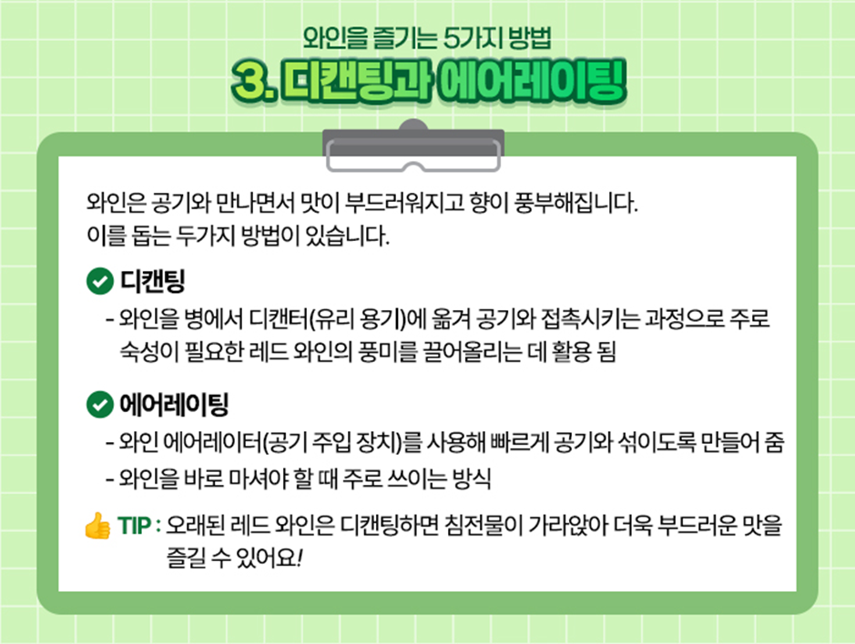 ✔ 에어레이팅: 와인 에어레이터(공기 주입 장치)를 사용해 빠르게 공기와 섞이도록 함. 바로 마실 때 추천!