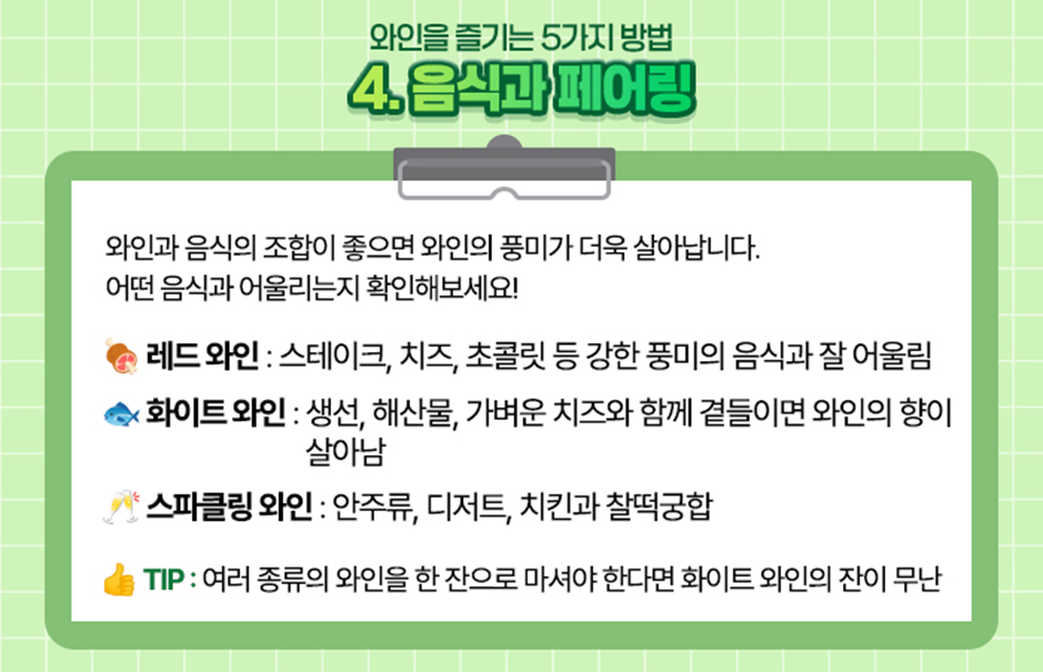 💡 TIP: 기본적으로 진한 음식에는 레드 와인, 가벼운 음식에는 화이트 와인을 매칭하면 실패 확률이 낮아요!