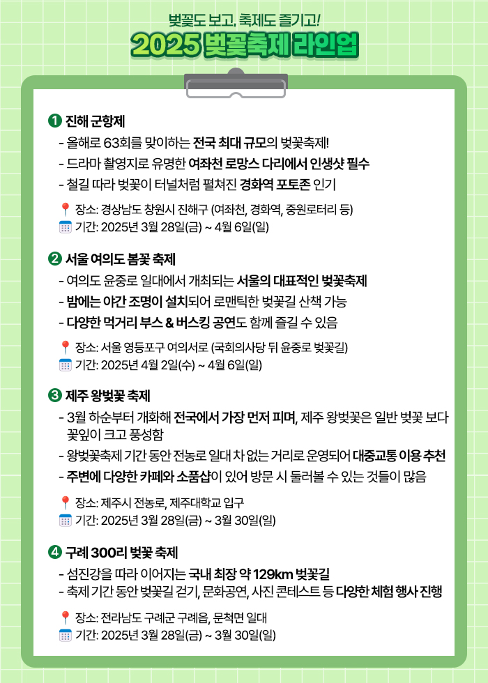벚꽃도 보고, 축제도 즐기고! 2025 벚꽃축제 라인업