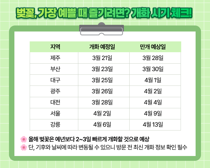벚꽃 개화 시기의 경우 지역별로 조금씩 차이가 있는데요. 대체적으로 평년보다 2~3일정도 빠를 것으로 예측하고 있습니다.🌸