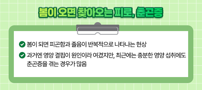 우리가 흔히 ‘춘곤증’이라 부르는 현상인데요. 예전에는 이런 증상이 영양 결핍에서 비롯된다고 여겼습니다.