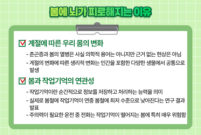 즉, 봄철에는 이런 작업기억의 저하로 인해 일상에서의 집중력과 주의력이 떨어질 수 있으며, 이로 인한 위험도 더 커질 수 있다는 점을 유의해야 합니다.