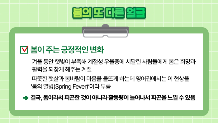 겨울 내내 해가 일찍 지고 무기력함에 시달렸던 사람들에게 봄은 오히려 희망과 생기를 불어넣어 주는 계절이기도 합니다.