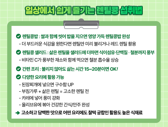 된장찌개에 넣어 구수한 맛을 더하거나, 삶은 렌틸을 부침가루에 섞어 전을 부치면 고소한 콩전이 완성됩니다.