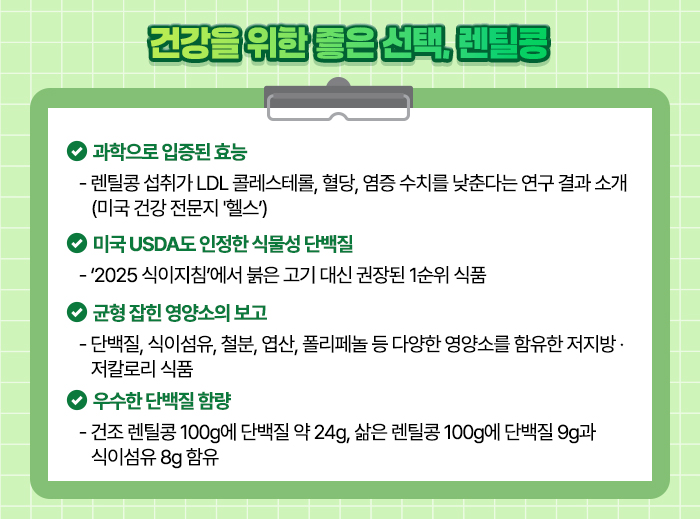 뿐만 아니라, 미국 농무부(USDA)는 ‘2025년 식이지침’을 통해 붉은 고기와 가공육 섭취는 줄이고, 식물성 단백질 섭취는 늘릴 것을 권장하며 렌틸콩을 가장 먼저 추천 식품으로 선정했습니다.