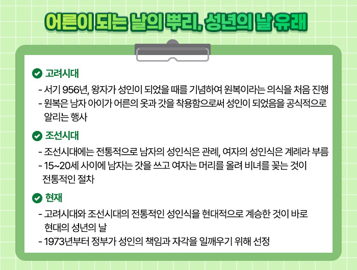 이처럼 오랜 세월 이어져 온 성인식을 현대적으로 계승한 날이 바로 ‘성년의 날’입니다.