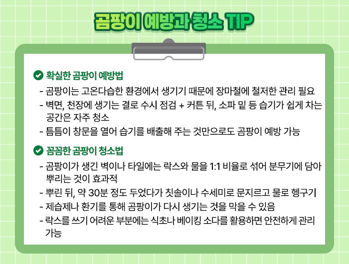 특히 벽면이나 천장에 생기는 결로를 자주 점검하고, 커튼 뒤나 벽지 속, 소파 밑처럼 습기가 차기 쉬운 공간은 수시로 청소해주는 것이 좋습니다.