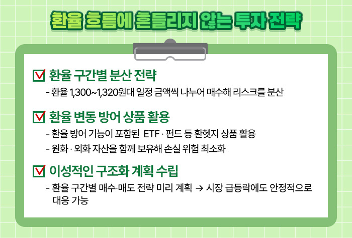 예를 들어 환율이 1,300~1,320원대 수준에 도달하면 일정 금액씩 나누어 매수하는 ‘분할 매수 전략’이 효과적일 수 있습니다. 해외 주식 투자 역시 환율이 낮을 때 집중적으로 매수하는 것이 더 유리합니다.