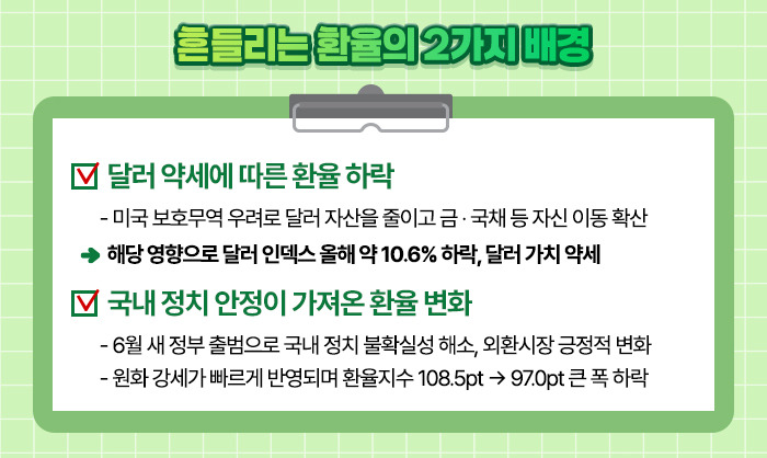 4월 탄핵 이후 6월에 새 정부가 출범하면서 국내 정치 상황이 안정되었고, 외환시장도 긍정적인 변화를 보였습니다. 특히 원화는 글로벌 달러 약세를 비교적 늦게 반영했지만, 반영 이후에는 다른 주요 통화보다 더 빠르게 하락했습니다. 2024년 말 기준 108.5pt였던 환율지수는 2025년 6월 말 97.0pt까지 하락해, 비교적 큰 폭의 변동을 보였습니다.