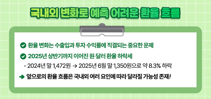 2024년 말 원·달러 환율은 약 1,472원이었지만, 2025년 6월 말에는 1,350원까지 떨어져 122원(약 8.3%) 정도 하락했습니다.