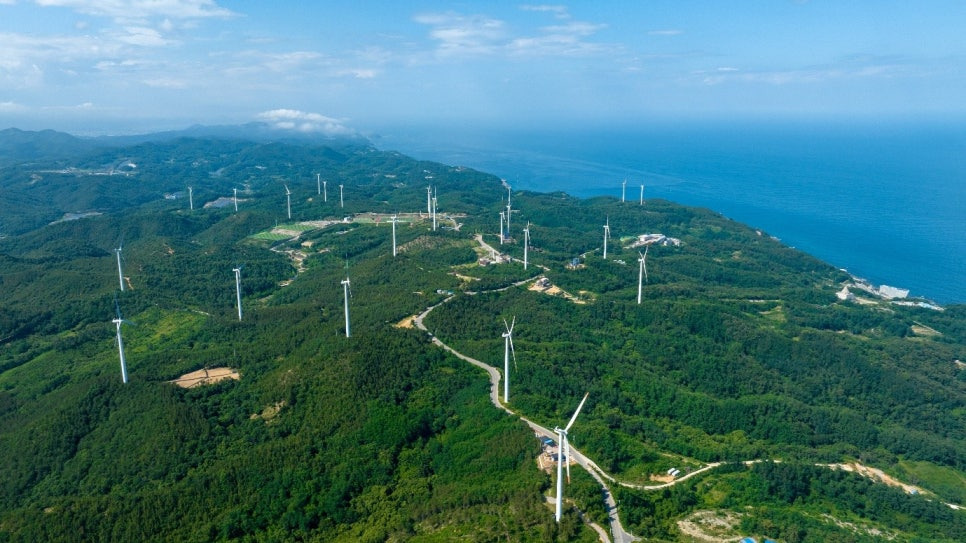 푸른 언덕 위로 줄지어 선 거대한 풍력 터빈이 바다를 배경으로 서 있는 모습은 마치 유럽의 시골 마을을 떠올리게 할 만큼 이국적인 분위기를 자아냅니다.