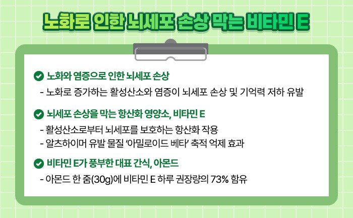 대표적인 항산화 영양소인 비타민 E는 뇌 세포를 공격하는 활성산소로부터 신경세포를 보호해주며, 알츠하이머의 주요 원인 중 하나로 알려진 ‘아밀로이드 베타 단백질’의 축적을 억제하는 역할도 합니다.