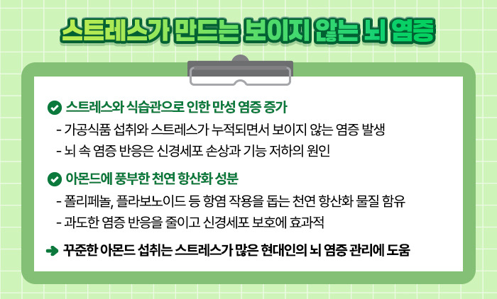 뇌도 예외는 아니죠. 이런 상황에서 아몬드 한 줌은 뇌를 보호하는 데 작은 힘이 되어줄 수 있습니다.