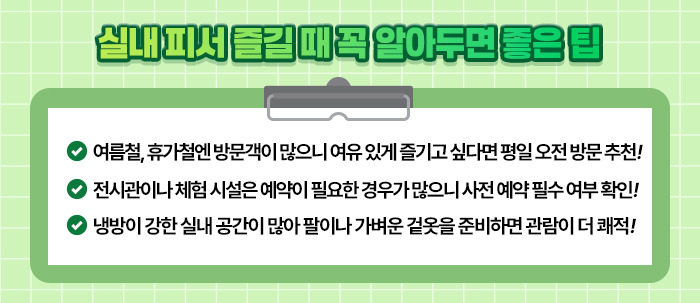 하지만 여름방학과 휴가철에는 실내 명소도 붐비기 쉬우니, 가능한 한 평일 오전 방문을 추천드립니다.
