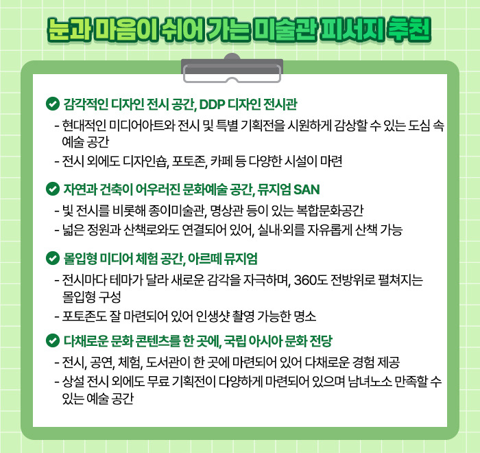 또한 전시 외에도 디자인숍, 포토존, 카페 등 다양한 시설을 갖추고 있어 도심 한가운데서 예술과 휴식을 동시에 누리기에 안성맞춤인 피서지입니다.
