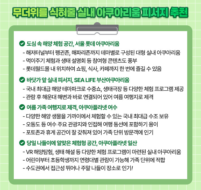 책을 읽으며 쉬는 ‘북캉스’, 예술을 감상하는 미술관, 아이들과 함께 즐기는 박물관, 그리고 바다를 만나는 아쿠아리움까지—