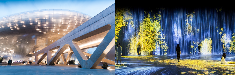 동대문디자인플라자(DDP)는 현대적인 전시와 트렌디한 미디어아트로 가득한 공간입니다.