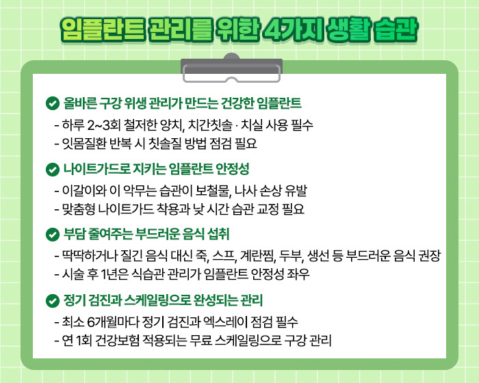 이처럼 작은 습관의 교정이 임플란트 안정성을 지키는 중요한 열쇠가 됩니다.