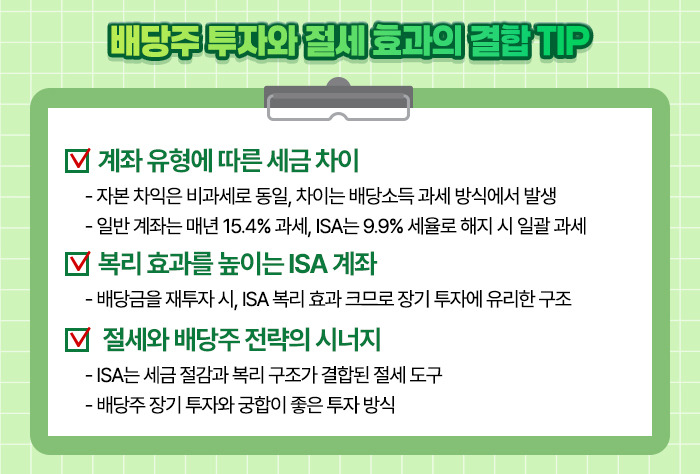 일반 계좌는 매년 배당소득의 15.4% 세금을 내야 하지만, ISA 계좌는 세율이 9.9%로 낮고 세금도 매년 내는 것이 아니라 계좌를 해지할 때 일괄 적용됩니다. 이 차이 덕분에 배당금을 재투자하면 일반 계좌보다 복리 효과가 더 커집니다.