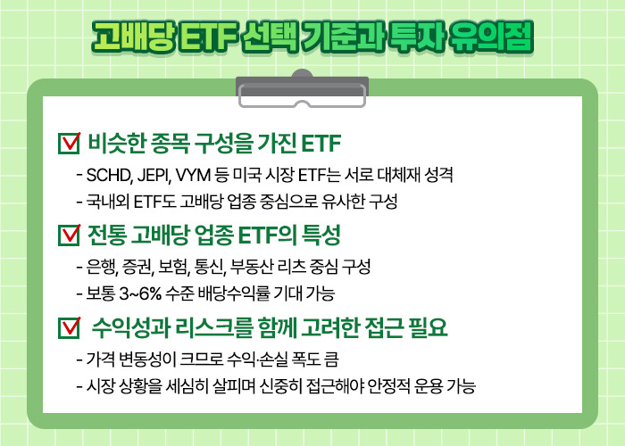 한편, 은행, 증권, 보험, 통신, 부동산 리츠처럼 전통적인 고배당 업종으로 구성된 ETF를 선택할 수도 있습니다.