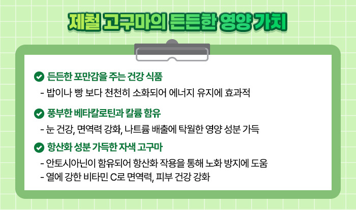 특히 가을철에 수확한 햇고구마는 맛과 영양이 가장 뛰어나, 일상에서 챙겨 먹기 좋은 제철 음식입니다.