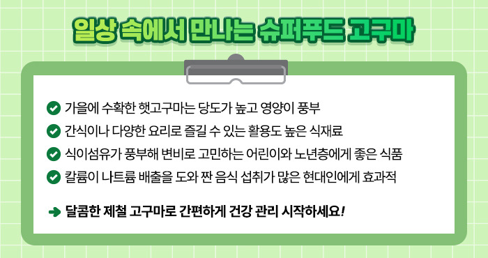 지금이 가장 맛있을 때인 만큼, 올가을에는 햇고구마로 건강도 챙기고 마음까지 따뜻하게 만들어 보세요.