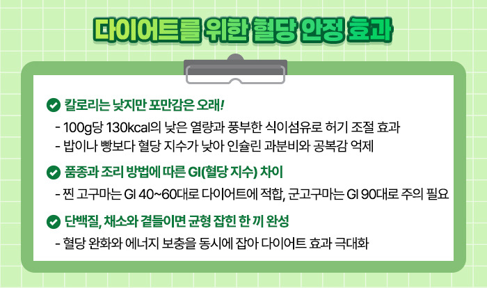 따라서 다이어트와 혈당 조절을 함께 생각한다면 ‘찐 고구마’가 가장 좋은 선택입니다.