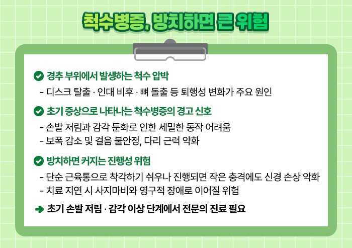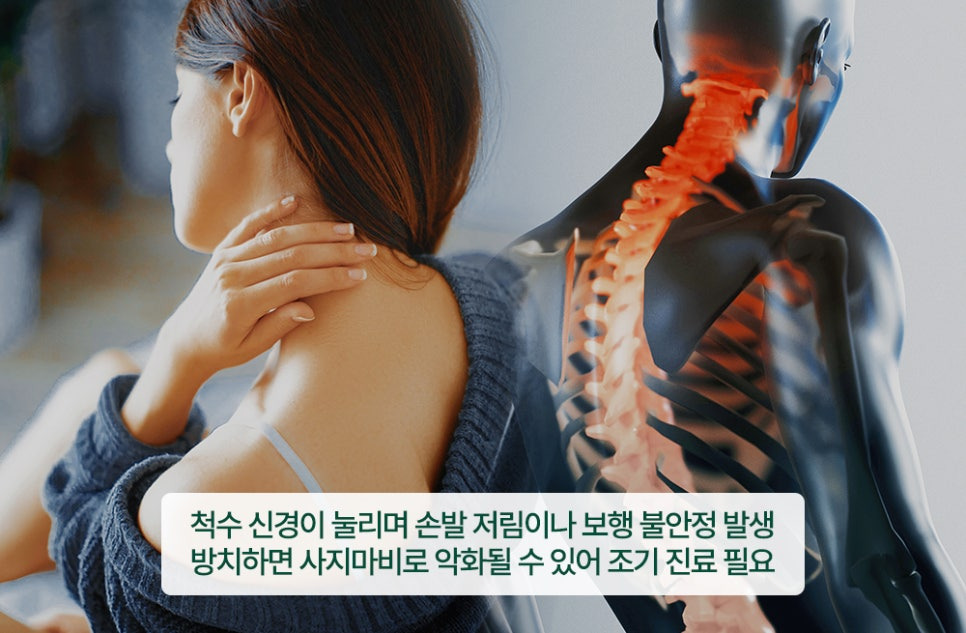 문제는 척수병증이 초기에는 손발 저림이나 가벼운 감각 이상으로만 나타나 방치하기 쉽다는 점입니다.