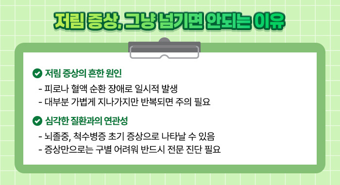 실제로 뇌졸중이나 척수병증과 같은 심각한 질환의 초기 증상으로 나타나기도 하므로 주의가 필요합니다.