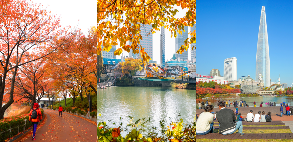 석촌호수는 도심 속 호수와 단풍이 어우러진 이색적인 풍경을 만날 수 있는 명소입니다.