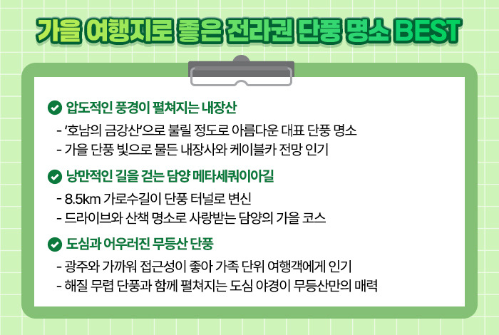인근의 죽녹원에서는 대나무 숲의 푸른 정취까지 함께 즐길 수 있어, 단풍과 대나무가 어우러지는 독특한 여행을 즐길 수도 있죠.