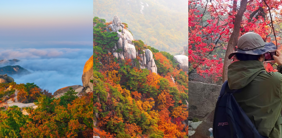울산바위의 거대한 암벽과 천불동 계곡, 비선대의 기암괴석은 붉고 노란 단풍과 어우러져 다른 곳에서는 보기 힘든 독특한 풍경을 만들어내죠.