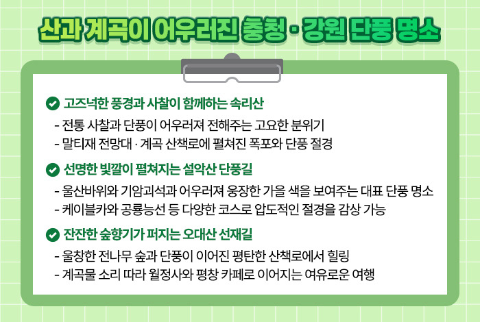 산과 계곡이 빚어내는 중부 충청권 및 강원권 단풍 명소