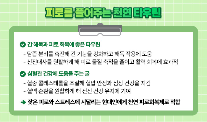 타우린은 아미노산의 일종으로, 신진대사를 촉진하고 피로 물질 축적을 억제하며 간 기능 개선에 도움을 줍니다.