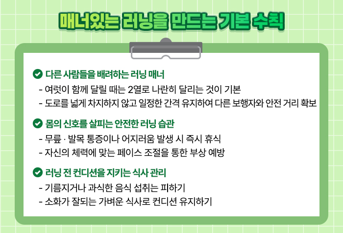 이런 작은 주의와 배려가 모여, 모두가 안전하고 즐겁게 달릴 수 있는 러닝 문화를 만든다는 사실, 잊지 마세요!