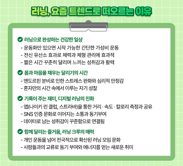 이 때문에 러닝은 ‘몸의 운동’이자 ‘마음의 운동’으로 불리며 멘탈 케어 수단으로 자리 잡고 있습니다.