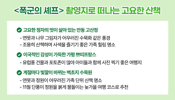 촬영지 또한 고요한 분위기 속에서 가족이 함께 여유를 느낄 수 있는 힐링 여행지로 주목받고 있습니다.