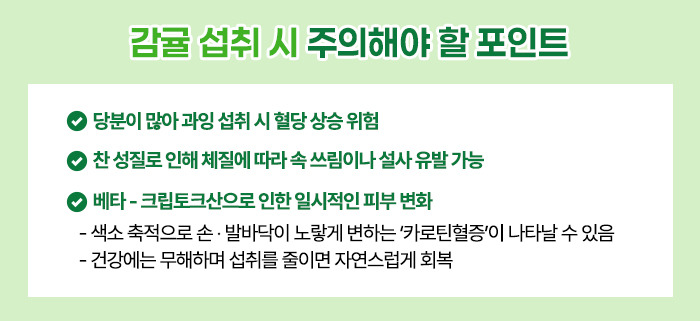 감귤에는 당분이 적지 않아 한 번에 많이 먹으면 혈당이 오를 수 있고, 찬 성질을 지니고 있어 과하게 섭취할 경우 속 쓰림이나 설사를 유발할 수 있습니다.