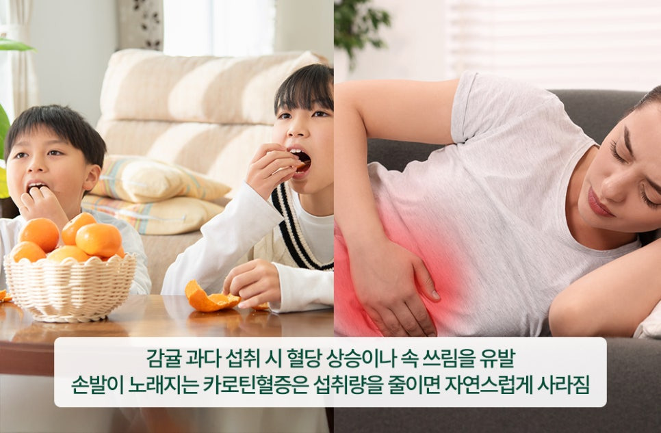 또한 감귤을 많이 먹었을 때 손이나 발바닥이 노랗게 변하는 ‘카로틴혈증’ 현상이 나타나기도 합니다.